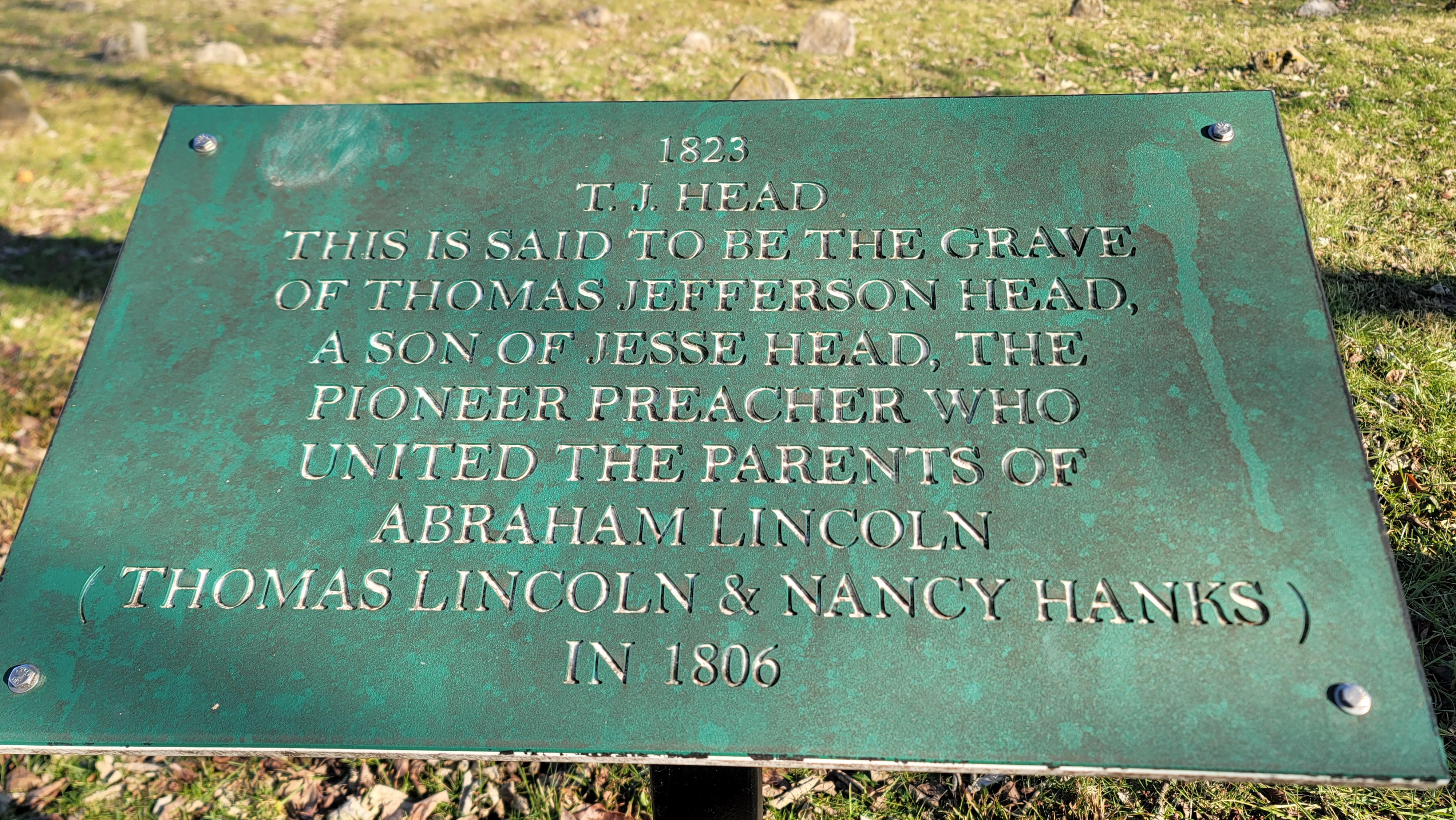Among the marked graves is one said to belong to Thomas Jefferson Head, the son of Rev. Jesse Head, the minister who married Abraham Lincoln’s parents, Thomas Lincoln and Nancy Hanks, in 1806.